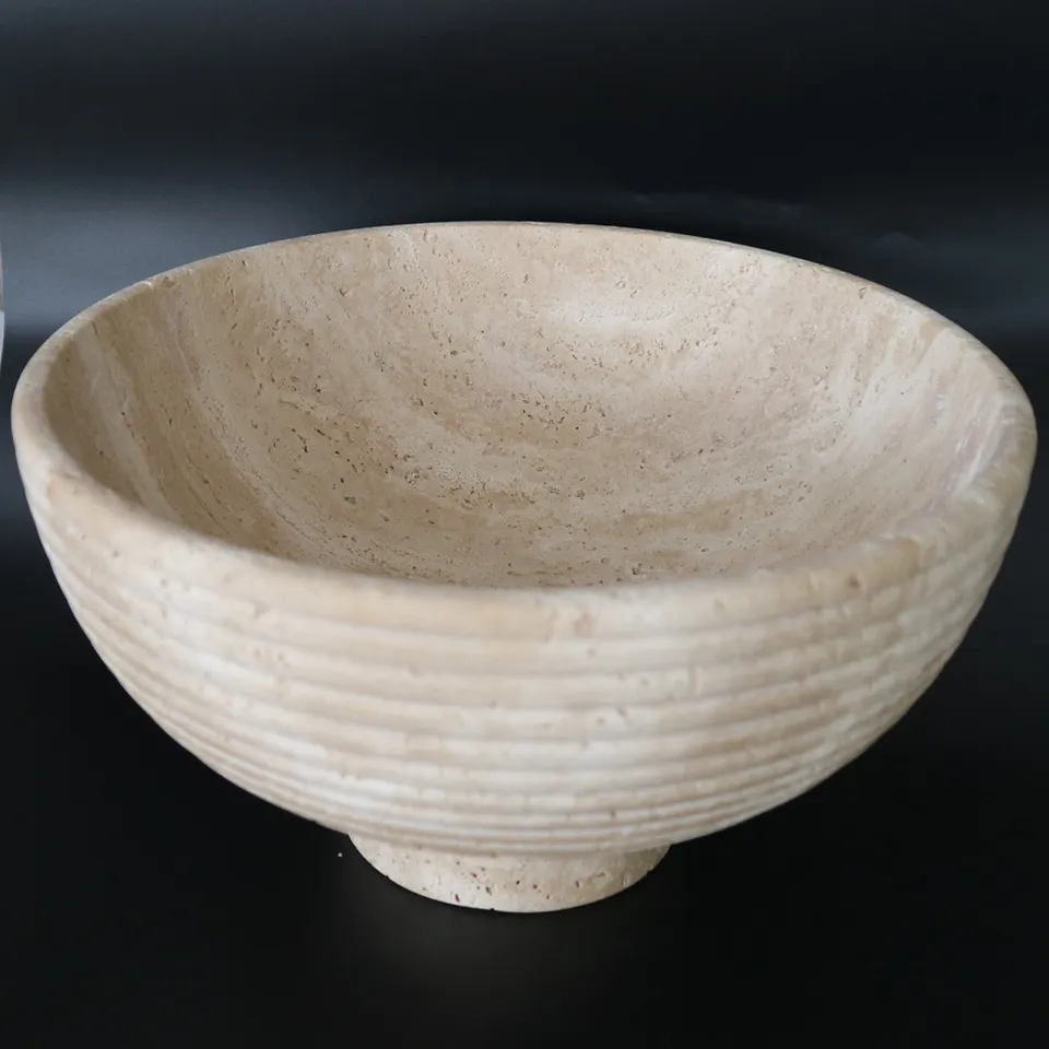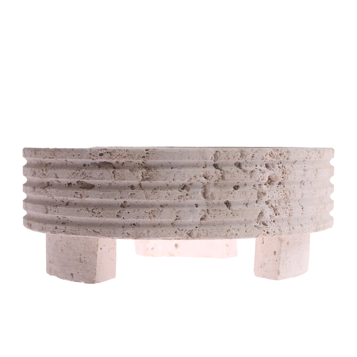 Travertine Stone Serving Decorate Bowls Round Footed Lines Design