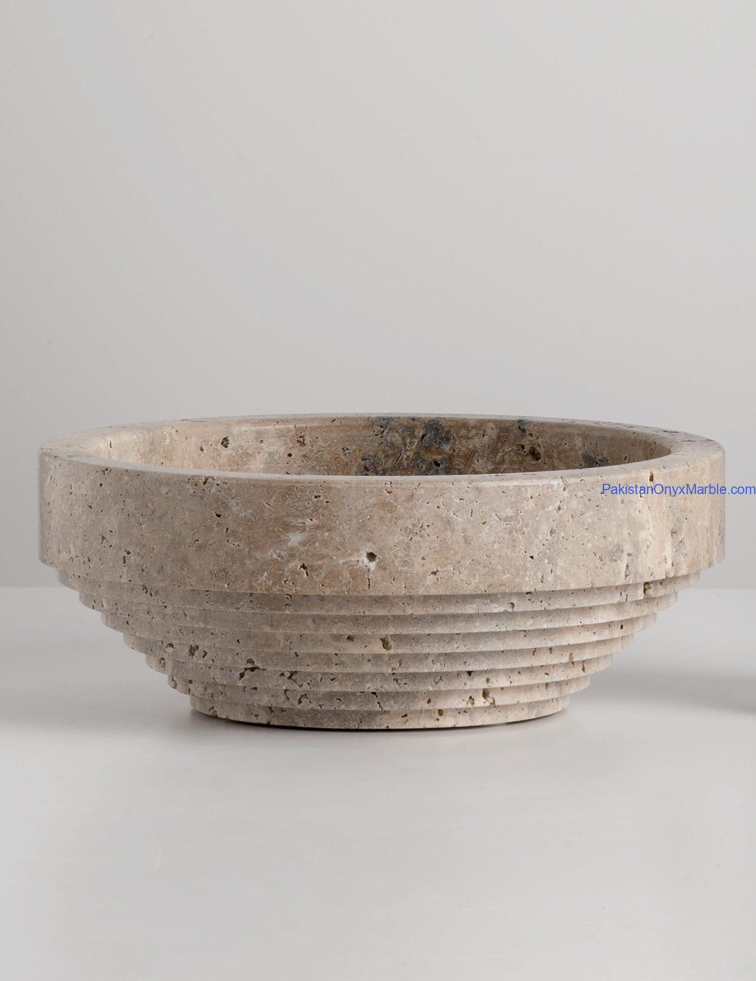 Pakistan Onyx Marble manufactures premium Travertine Round Footed Bowls with Lines Design, carved from Grade-A Natural Travertine featuring beige, cream, and vein-cut textures.